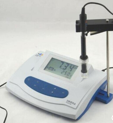 c) 按“溫度” 鍵,使儀器進入溶液溫度設置狀態(此時“℃”溫度單位指示),按“△”鍵或“▽”鍵調節溫度顯示數值上升或下降,使溫度顯示值和被測溶液溫度值一致,然后按“確認”鍵,儀器確定溶液溫度后回到pH測量狀態。